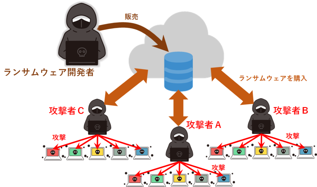 その「ビジネスモデル」では、高度な専門チームから成る「サービス提供者」が開発したランサムウェア攻撃ツールを、「サービス利用者」である他の犯罪者に「販売」または「レンタル」します。これにより、ランサム攻撃実行犯はランサムウェアを簡単にダウンロードして攻撃を仕掛けて身代金を得た後、その一部を提供者に支払うことで、双方にとって魅力的な収益源となっているのです。